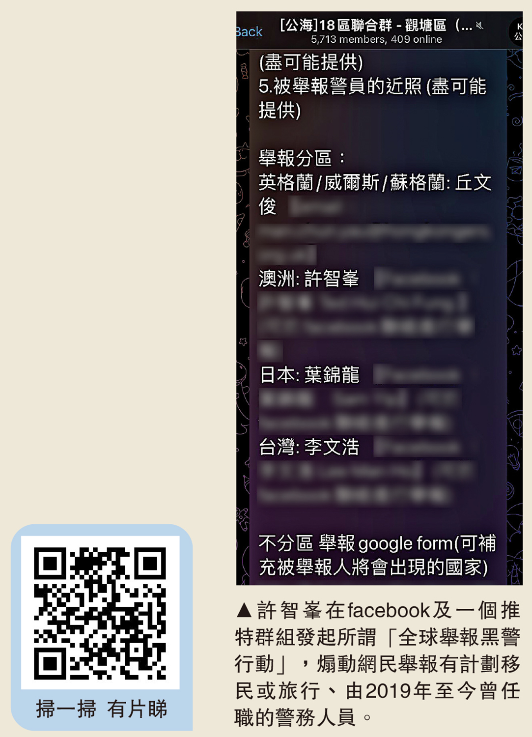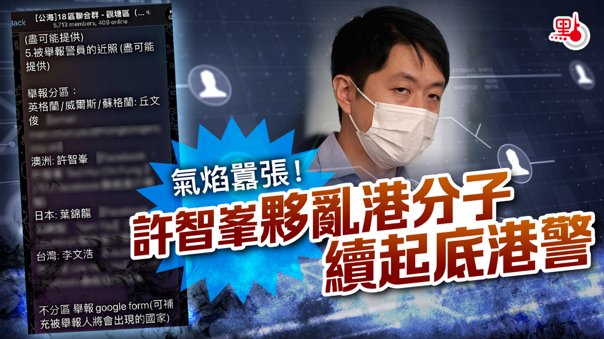 許智峯潛逃後,先前往丹麥,再先後轉至英國及澳洲,長期勾結海外反華勢力攻擊中央及特區政府。今年7月1日,許智峯在其facebook及一個推特群組發起所謂「全球舉報黑警行動」,煽動網民舉報有計劃移民或旅行、由2019年至今曾任職的警務人員。他要求舉報人提供警員的姓名、出生資料、身份證、近照以至警員委任證等個人資料,帖文稱會跟進有關舉報資料,通過「合適」渠道,移交當地國家政府機關處理云云。