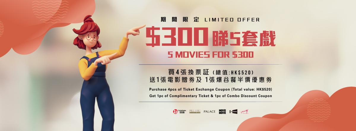 百老匯院線由即日起,推出限定優惠「$300睇5套戲」,平均每張戲票只需60元,而且可以即買即用。限定優惠每套會附上4️張換票證(總值520元)以及一張電影贈券,更會贈送一張爆谷餐半價優惠券,全線12間百老匯院線戲院,包括百老匯、MOViE MOViE、B+ cinema、MY CINEMA等均適用。市民可以前往戲院售票處購買,戲院小賣部網站亦會售賣,每人每次限購3套,有效日期至2023年11月30日。