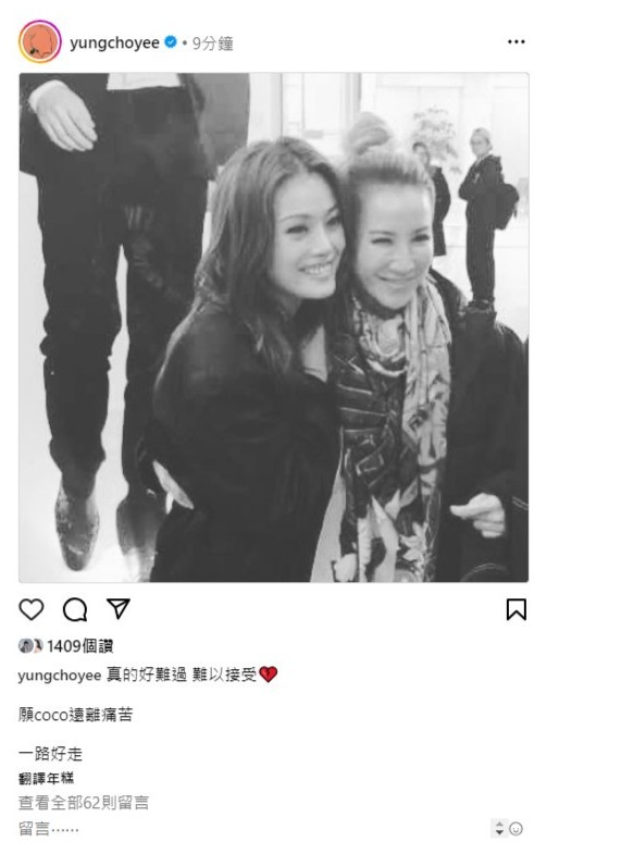 容祖兒上載與李玟合照,並留言:「真的好難過,難以接受,願CoCo遠離痛苦,一路好走。」
