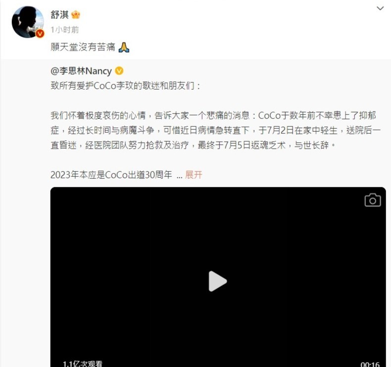 舒淇在微博轉載李玟家人所發的訃文,並留言說:「願天堂沒有苦痛。」