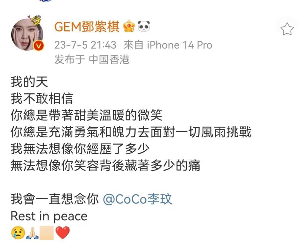 鄧紫棋GEM在微博留言表示:「我的天,我不敢相信,你總是帶着甜美溫暖的微笑,你總是充滿勇氣和魄力去面對一切風雨挑戰,我無法想像你經歷了多少,無法想像你笑容背後藏着多少的痛。我會一直想念你。Rest in peace.」