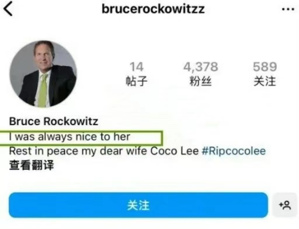 【點新聞報道】樂壇天后李玟(CoCo)因抑鬱症輕生,終年48歲。與李玟正辦理離婚的分居丈夫Bruce Rockowitz早前現身,以摯愛妻子為形容發訃聞,指「CoCo是一位內外美麗兼備,溫暖和善良的人」。今日(8日),網上流傳一張疑似IG賬號截圖,一個疑似Bruce Rockowitz的賬號,把自己的IG簡介改成了「I was always nice to her. Rest in peace my dear wife Coco Lee (我一直都對她很好,願你安息,我親愛的妻子李玟)」。此賬號隨後又設置成私密。