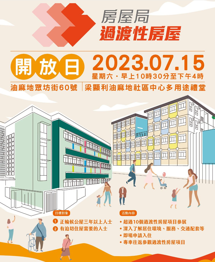 【點新聞報道】為加強向公眾介紹過渡性房屋項目,以及便利有需要人士遞交申請,房屋局將於7月15日(星期六)舉辦過渡性房屋開放日,參觀元朗「同心村」、「博愛江夏圍村」、赤柱「尚晉坊」。