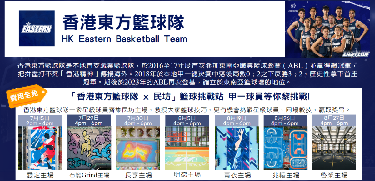 香港東方籃球隊是本地首支職業籃球隊,早於2016至17年度首次參加東南亞職業籃球聯賽(ABL)便贏得總冠軍,把拚盡打不死「香港精神」傳揚海外。球隊2023年ABL再次蟬聯總冠軍,確立東南亞籃球壇的領先地位。民坊與香港東方籃球隊破天荒合作推出首個紀念版籃球產品,顧客可以於7月15日率先在屯門愛定商場以電子消費滿800元(憑最多4張機印收據),即有機會換取「民坊x香港東方籃球隊 」紀念版籃球一個。其它地區的民坊商場亦會陸續展開換取計劃。數量有限,換完即止。