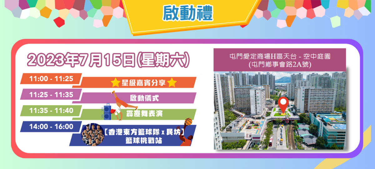 民坊將於本周六(7月15日)假愛定商場H區天台-空中庭園舉辦「港隊齊集民坊 型動最酷盛夏」啟動禮,屆時香港東方籃球隊領隊蔡芳裕及一眾星級球員、香港女子馬拉松紀錄保持者姚潔貞、香港中長跑運動員陳家豪、香港攀登青年隊教練熊嘉威及香港攀登青年隊成員、前港隊劍擊隊成員湯振傑、2012年倫敦奧運香港劍擊代表梁嘉明、中國香港新興運動協會創辦人黎廣業、中國香港健美總會教育及發展委員會主席、KIDS FIT 創辦人麥文科、Nova Skate星霖滾軸運動創辦人黃漢滔及Pentaverse街舞舞團將會出席,詳細介紹他們帶領的運動項目及分享心得。由香港東方籃球隊成員作嘉賓導師的「籃球挑戰站」為整個項目打響頭炮。同日,運動員亦會到訪愛定商場手作市集,為一眾小店打氣。