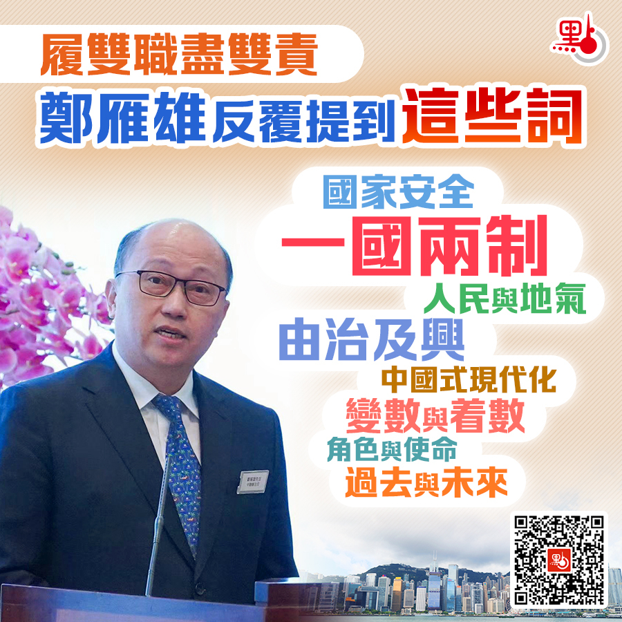 【點新聞報道】中聯辦主任鄭雁雄上任至今滿半年,他今日在立法會午宴中提到,「大家都看到報道了,我又多了一個職位」。中央改革港澳工作機構,設中央港澳工作辦公室,保留國務院港澳辦牌子。香港工作是「國之大者」,是中華民族偉大復興的重要一環,身為中央港澳辦副主任及香港中聯辦主任,鄭雁雄的多次講話中,反覆提及的「高頻詞」有哪些?