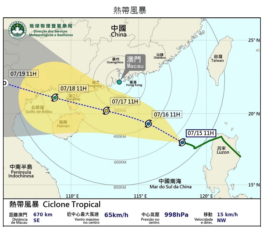 【點新聞報道】澳門地理物理暨氣象局昨日(14日)晚間22:30分發出一號風球信號。今日(15日)上午11時,氣象局指,熱帶風暴集結在澳門東南約670公里。目前,一號風球仍然生效,預料會在日間維持。