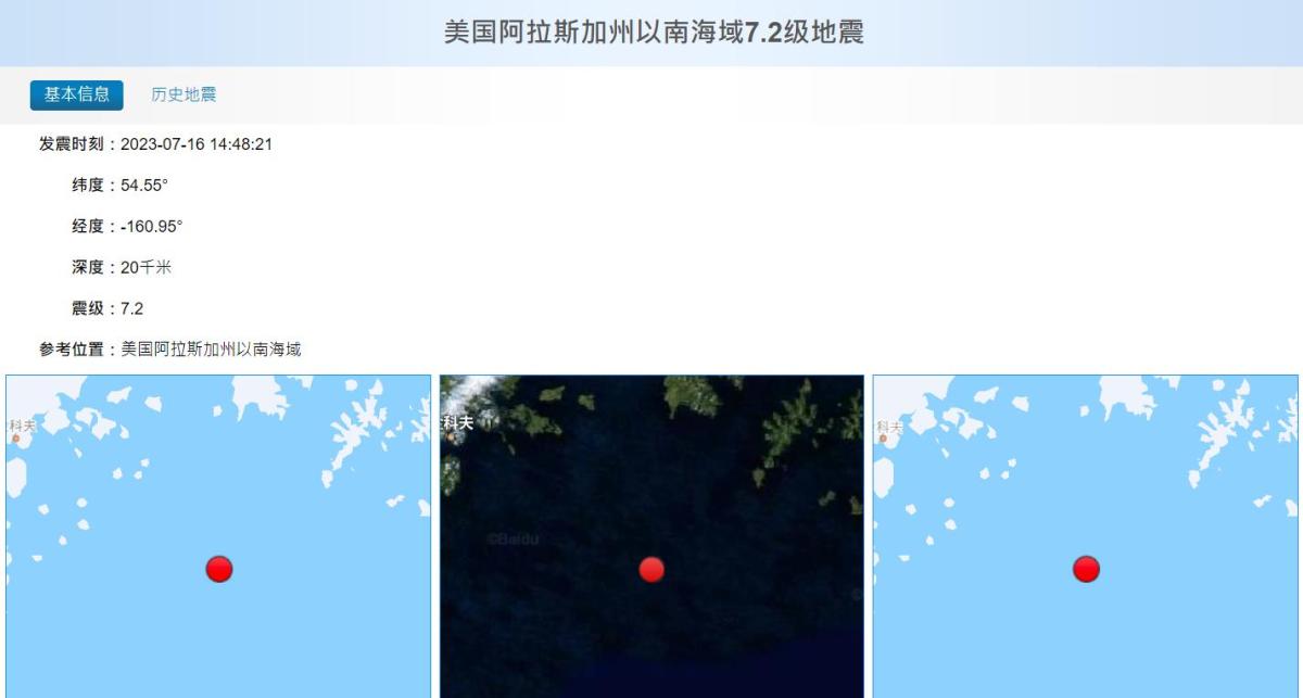 【點新聞報道】中國地震台網正式測定:07月16日14時48分在美國阿拉斯加州以南海域(北緯54.55度,西經160.95度)發生7.2級地震,震源深度20千米。