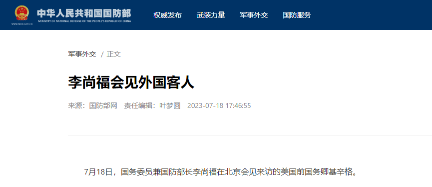 【點新聞報道】國務委員兼國防部長李尚福今日(18日)在北京會見來訪的美國前國務卿基辛格。