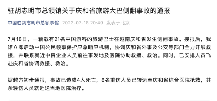 據越方初步通報,事故已造成4人死亡,8名重傷人員已轉運至慶和省綜合醫院搶救,其餘輕傷人員就近送當地醫院治療。