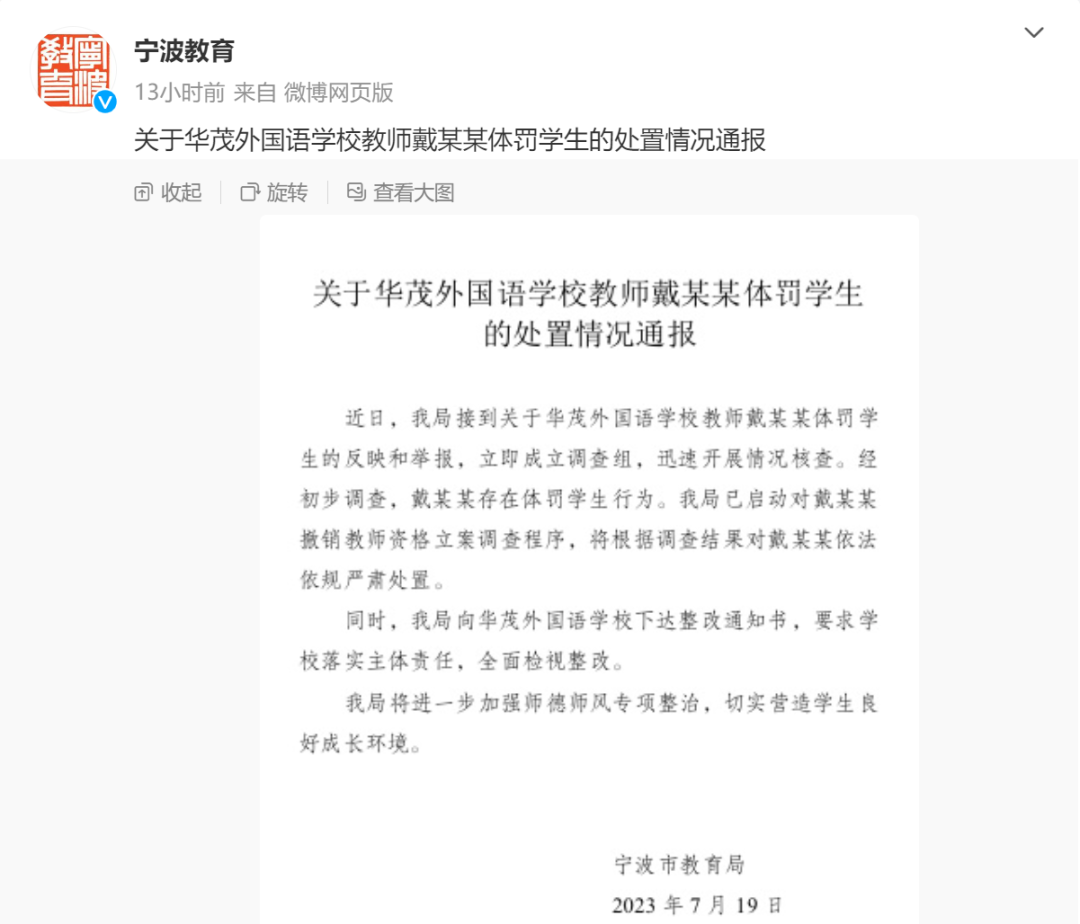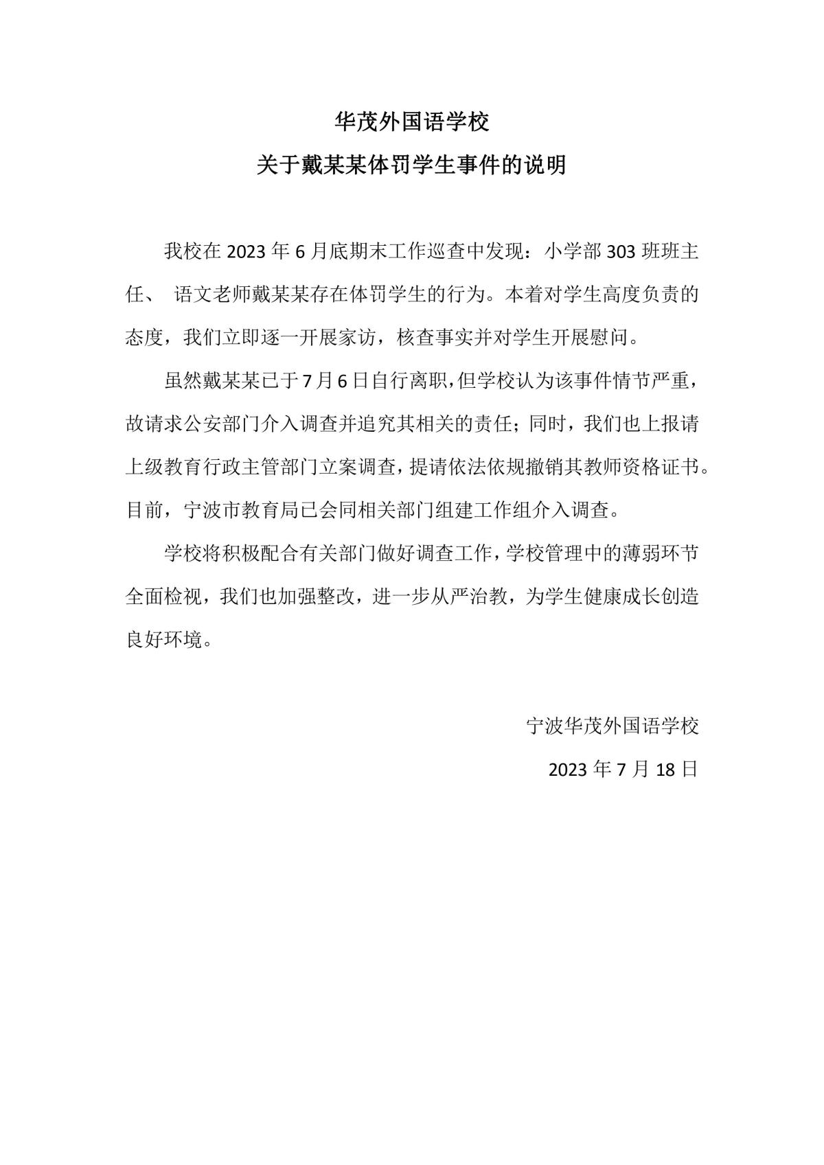 寧波華茂外國語學校官網18日發布「關於戴某某體罰學生事件的說明」稱,該校在2023年6月底期末工作巡查中發現,小學部303班班主任、語文老師戴某某存在體罰學生的行為。校方立即逐一開展家訪,核查事實並對學生開展慰問。雖然戴某某已於7月6日自行離職,但學校認為該事件情節嚴重,故請求公安部門介入調查並追究其相關的責任。