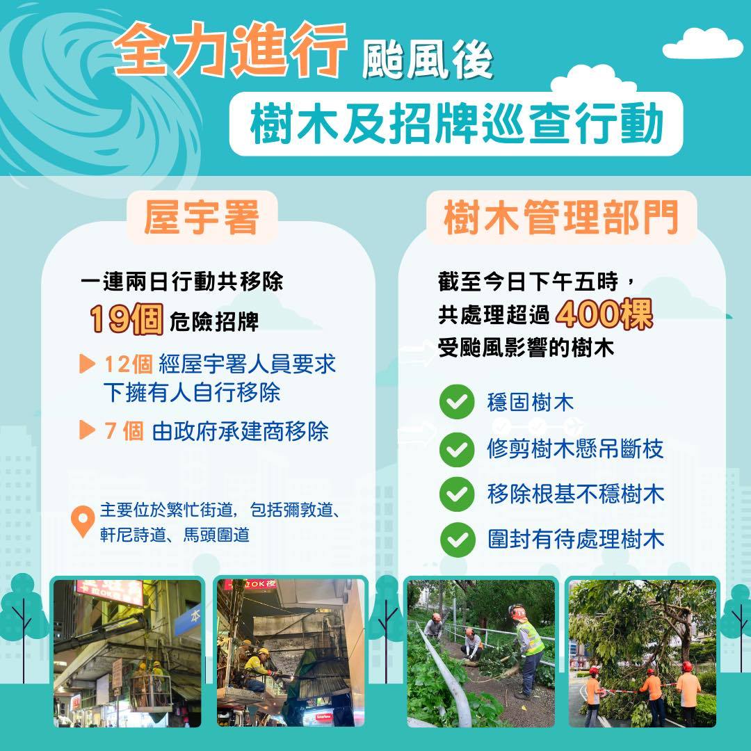 發展局18日表示,截至當日下午4時,樹木管理部門共處理了超過400棵受颱風影響的樹木,包括穩固樹木,修剪樹木的懸吊斷枝及移除根基不穩的樹木等,以保障市民安全。由於位處高人流車流地點的樹木數目眾多,有關巡查及風險緩減工作將會在未來數天繼續進行,而有待處理的樹木已圍封,請市民保持安全距離,免生意外。