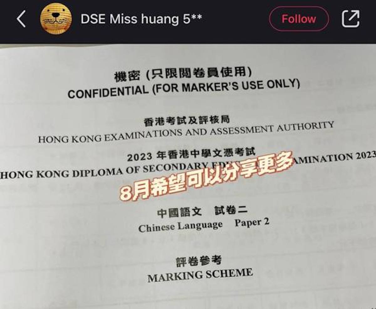 【點新聞報道】近日內地社交平台「小紅書」有一名自稱為「中文科閱卷員」的「DSE 5**王老師」用戶,公開一份寫有2023年DSE「機密(只限閱卷員使用)」的批改參考文件。考評局本周二(18日)曾表示,相關事件屬於嚴重違反守則,已報警交由警方處理。考評局強調,有要求考務人員保密協議,而且協議沒有時限,相關人員須嚴格執行。警方昨日(21日)拘捕一名男子,涉嫌違反《香港考試及評核局條例》。
