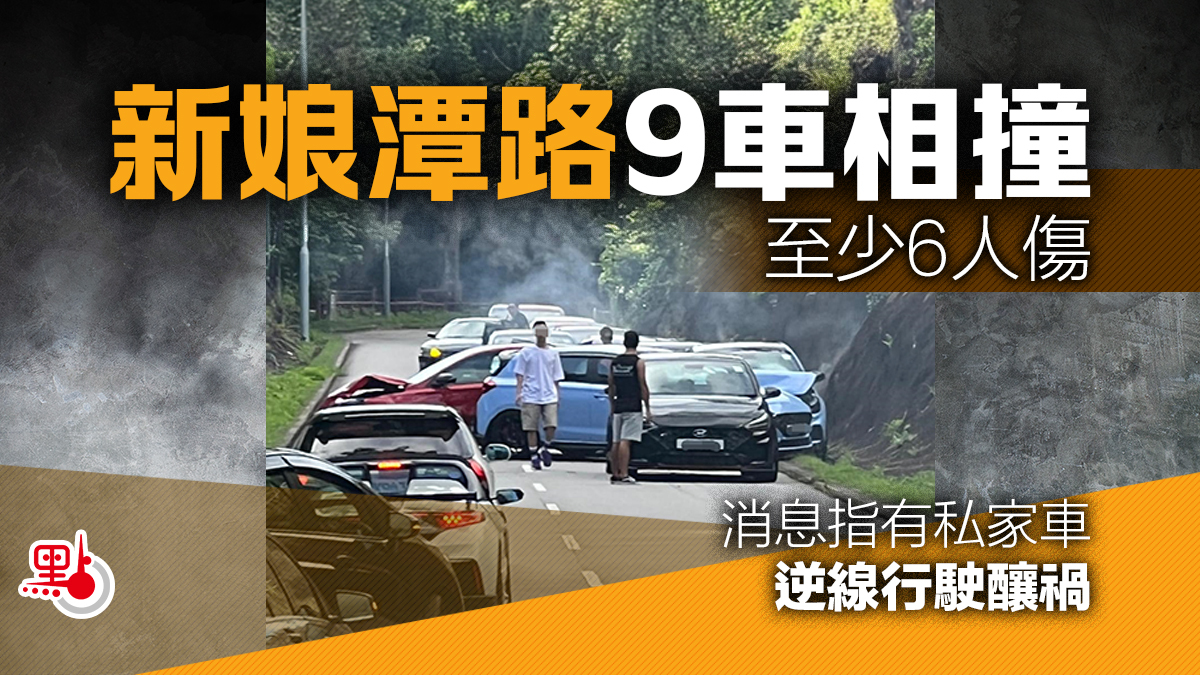 【點新聞報道】今(23日)晨7時43分,一輛私家車駛至新娘潭路近烏蛟騰路時,懷疑逆線行駛,導致至少9輛私家車相撞,逆線的私家車司機棄車逃去。據初步了解,意外至少釀成6人受傷,幸各人傷勢均不嚴重,分別由救護車送院治理。