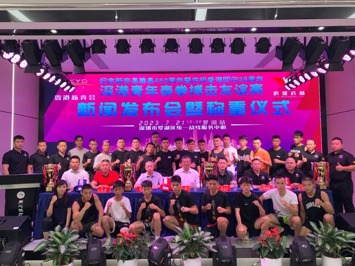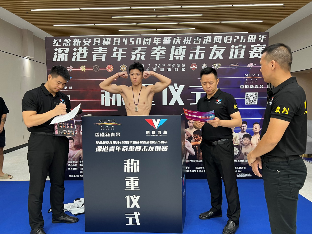【點新聞報道】由新青會主辦的紀念新安縣建縣450周年暨慶祝香港回歸26周年深港青年泰拳搏擊友誼賽羅湖站於7月21日舉行了新聞發布會暨稱重儀式。7月22日在深圳市羅湖體育館比賽正式開鑼成功舉辦。