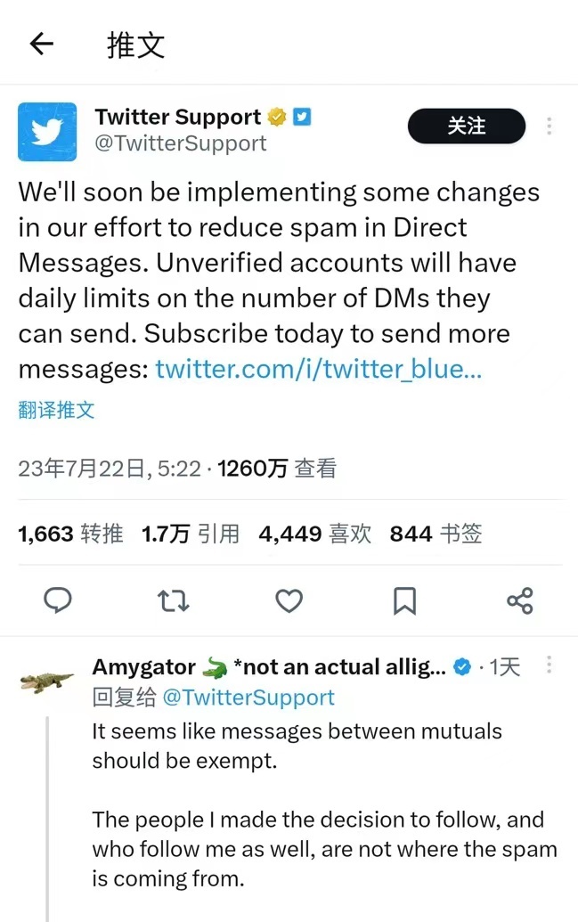 【點新聞報道】Twitter(推特)官方22日宣布,將正式限制未經驗證(非Twitter Blue)賬戶每天發送的直接消息數量,官方稱此舉是為了減少垃圾消息的產生量。