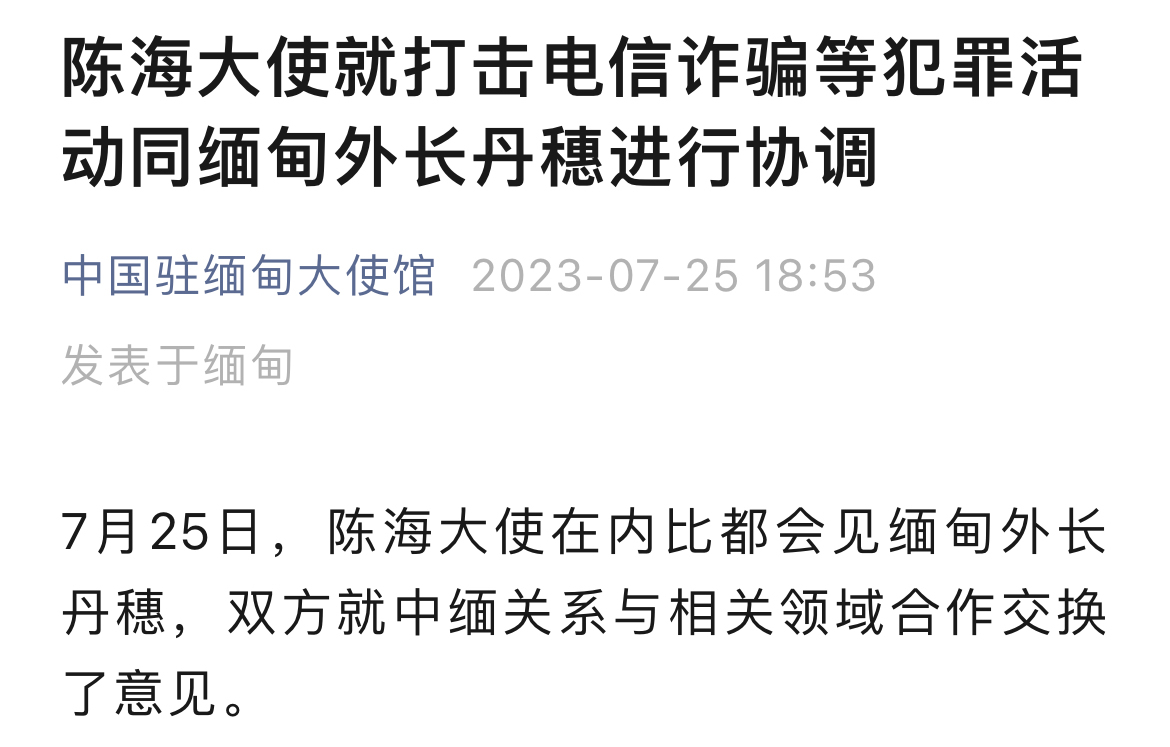陳海大使同丹穗外長就中緬合力打擊緬甸境內電詐網賭等犯罪活動進行專題協調。陳海大使指出,針對緬甸邊境地區電詐犯罪活動蔓延,中緬雙方及中緬泰三方開展聯合打擊行動,取得初步成效。儘管如此,包括緬北在內緬甸邊境地區電詐活動依然猖獗,嚴重損害中緬兩國民眾切身利益。中國政府對此高度重視,中國民眾對此深惡痛絕。雙方應進一步採取有力措施,同其他相關鄰國合力開展新一階段聯合打擊行動,全力剷除電詐窩點,解救被困中方人員,根除緬甸境內詐賭毒瘤,將犯罪勢力及其組織人員繩之以法,維護中緬友好合作大局。