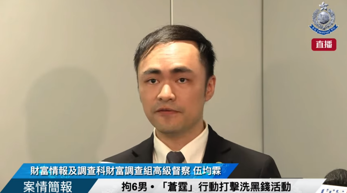 【點新聞報道】警方財富情報及調查科人員於本年年初展開名為「蒼霆」的拘捕行動。並於7月25日展開拘捕行動,以「串謀洗黑錢」及「洗黑錢」罪拘捕6名本地男子,年齡介乎24至36歲。警方財富情報及調查科財富調查組高級督察伍均霖今日(26日)對案情作簡報。