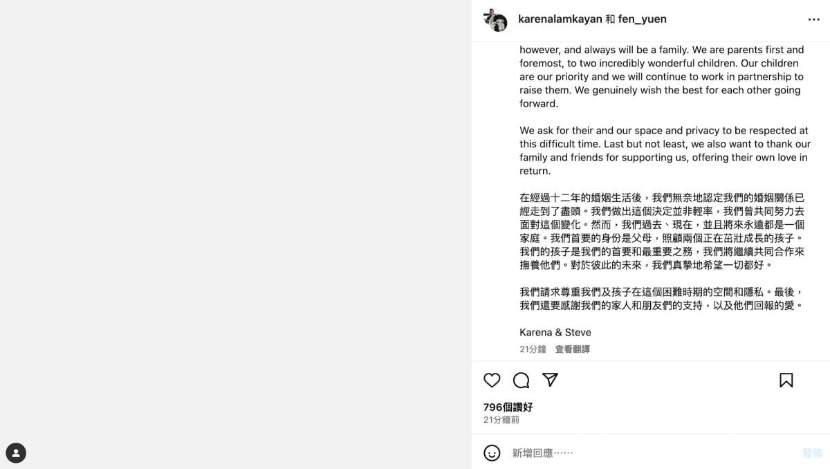 前日(28日)林嘉欣在IG發空白圖片配以與袁劍偉共同所發的離婚聲明寫道:「在經過十二年的婚姻生活後,我們無奈地認定我們的婚姻關係已經走到了盡頭。我們做出這個決定並非輕率,我們曾共同努力去面對這個變化。然而,我們過去、現在,並且將來永遠都是一個家庭。」兩人表示,會共同撫養兩個女兒。