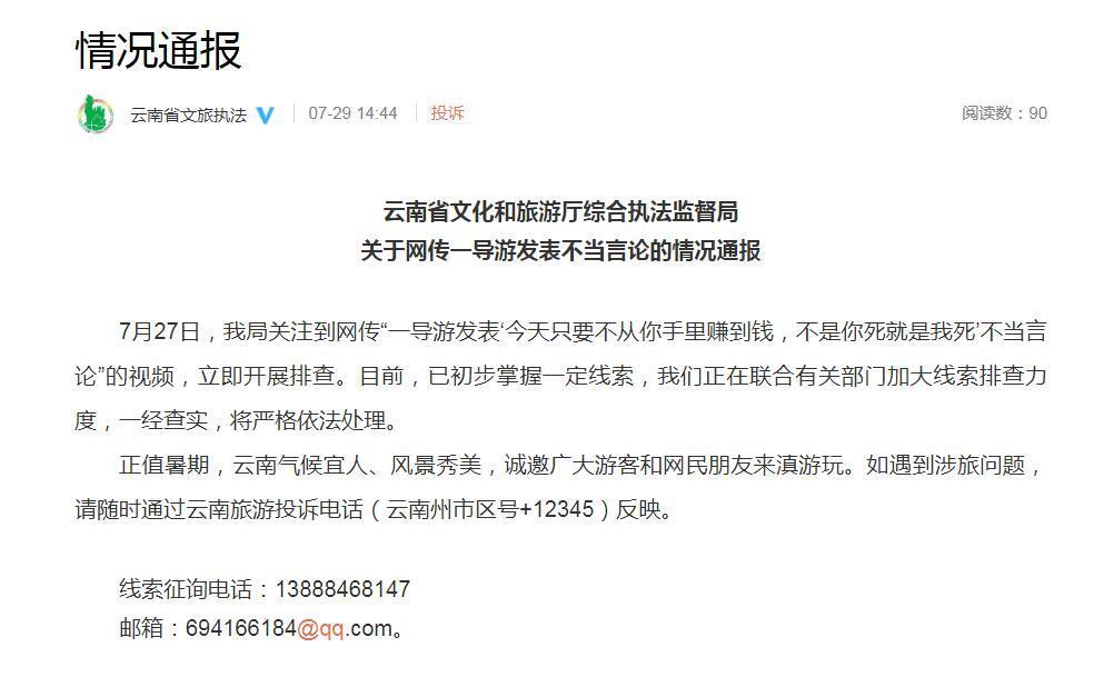 雲南省文化和旅遊廳綜合執法監督局今日(29日)發布情況通報,7月27日,我局關注到網傳視頻,立即開展排查。目前,已初步掌握一定線索,我們正在聯合有關部門加大線索排查力度,一經查實,將嚴格依法處理。正值暑期,雲南氣候宜人、風景秀美,誠邀廣大遊客和網民朋友來滇遊玩。如遇到涉旅問題,請隨時通過雲南旅遊投訴電話(雲南州市區號+12345)反映。
