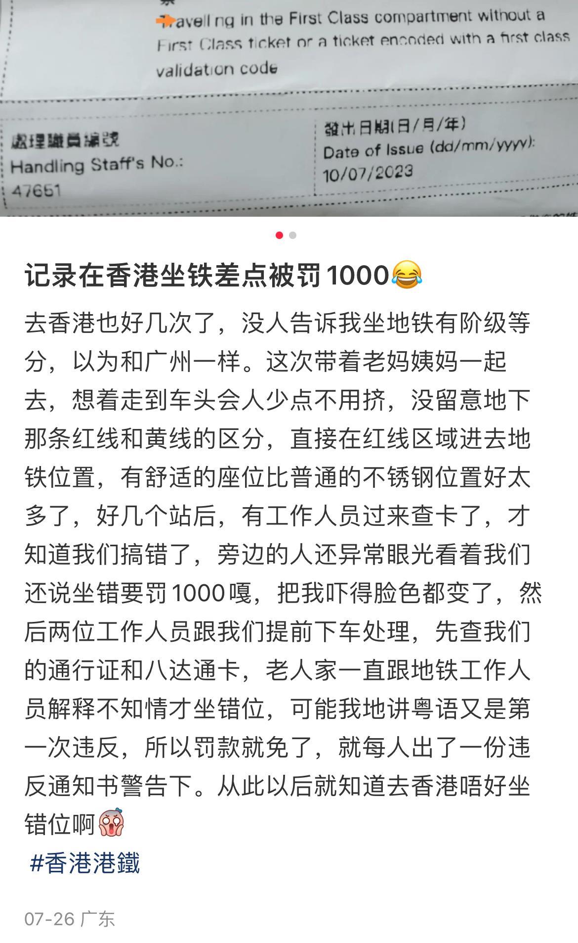 事主上載《違反附例通知書》的相,其中列明她與家人違反的附例為15(1)(aa)「乘搭頭等車廂而未持有頭等車票或沒有頭等核准記錄的車票」。通知書上強調「若你再次違反港鐵附例,可被檢控」,意味今次事主未被控,亦毋須罰款。