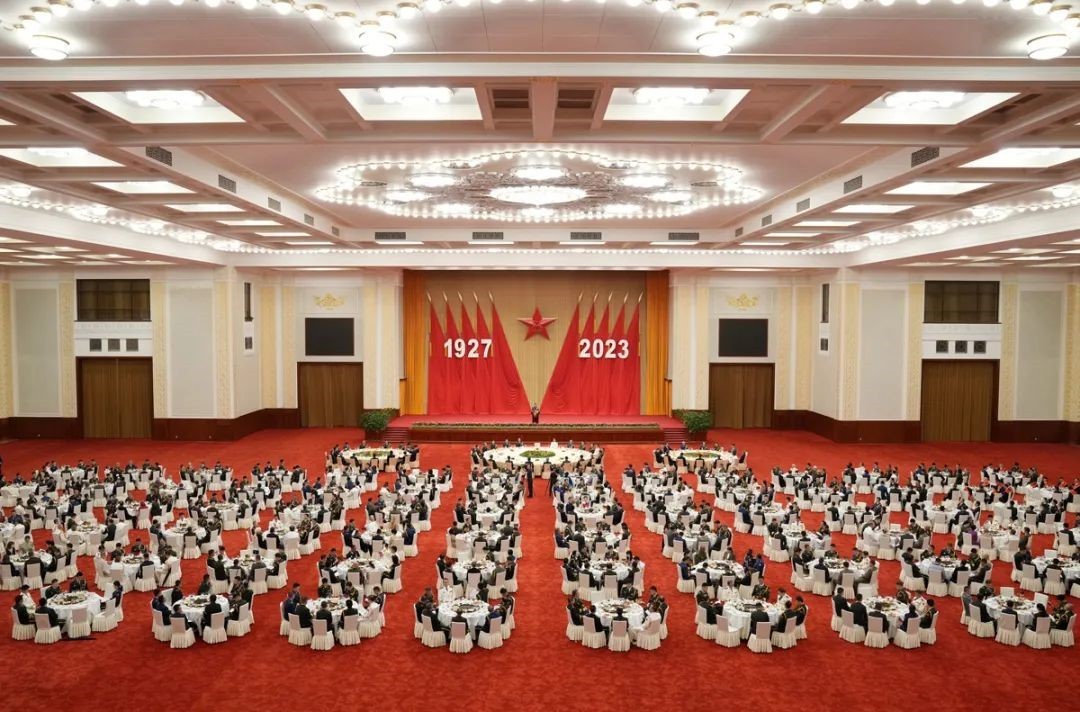 人民大會堂氣氛熱烈,中外嘉賓歡聚一堂。主席台帷幕正中莊嚴的「八一」軍徽熠熠生輝,10面紅旗分列兩側。「1927—2023」的大字年號,昭示着中國人民解放軍走過96年的光輝歷程。