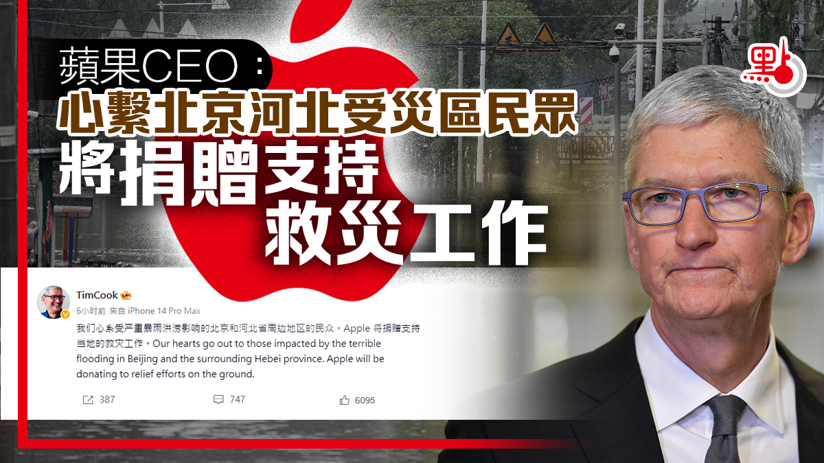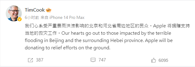 庫克寫道,「我們心繫受嚴重暴雨洪澇影響的北京和河北省周邊地區的民眾。Apple將捐贈支持當地的救災工作。(Our hearts go out to those impacted by the terrible flooding in Beijing and the surrounding Hebei province. Apple will be donating to relief efforts on the ground. )」