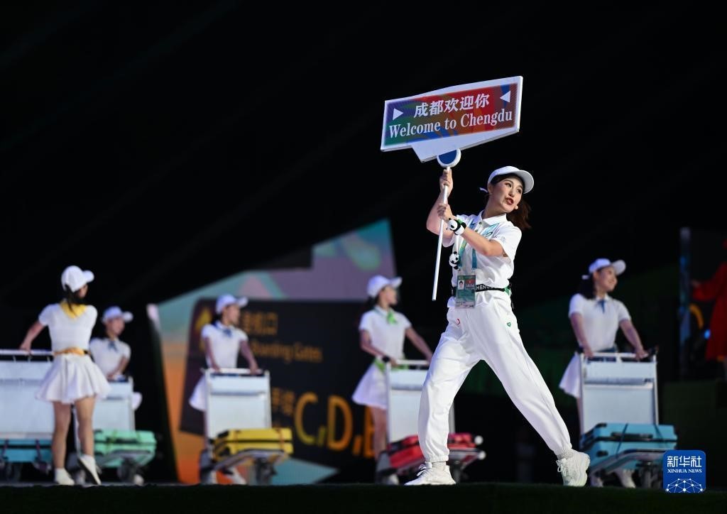 此外,多位志願者造型的演員以機場迎賓、賽場服務、大運村保障、城市服務等志願服務為主體,演繹出志願服務中一個個美好瞬間。