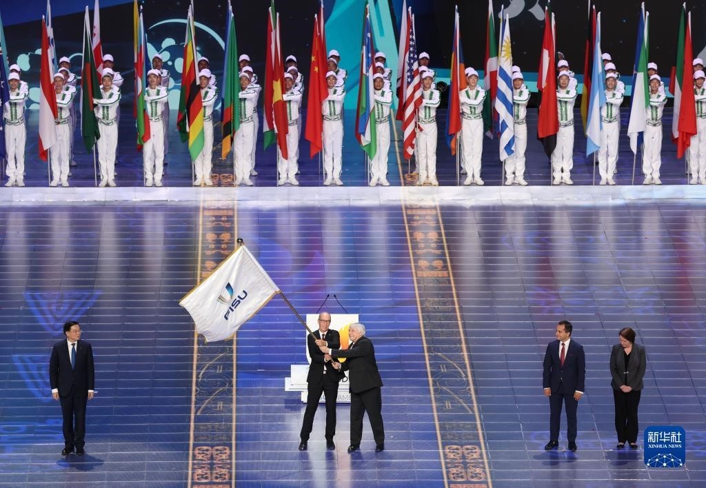 表演之後,國際大學生體育聯合會會旗交接儀式開始。下屆主辦城市德國的萊茵-魯爾在現場進行「水火之舞,燃情與共」文藝表演。