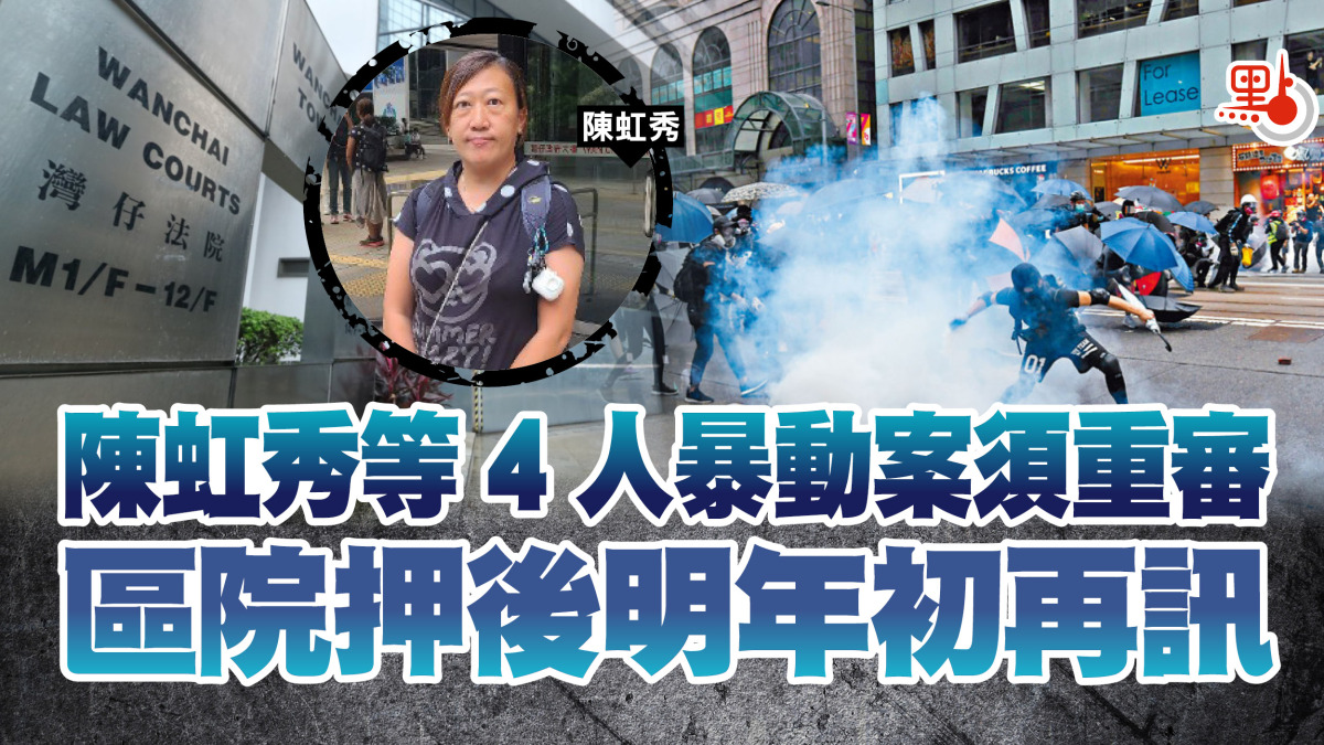 區域法院前法官沈小民早前裁定兩宗灣仔暴動案共13名被告罪脫,包括社工陳虹秀,律政司其後以案件呈述的方式提出上訴,上訴庭早前下令撤銷陳虹秀等4名被告的無罪裁定,發還區域法院另一法官席前重審。案件昨在區域法院提訊,庭上透露陳虹秀已就上訴庭裁決申請上訴至終審法院,希望將本案押後。法官將案押後至明年1月23日再訊,4人續准保釋。