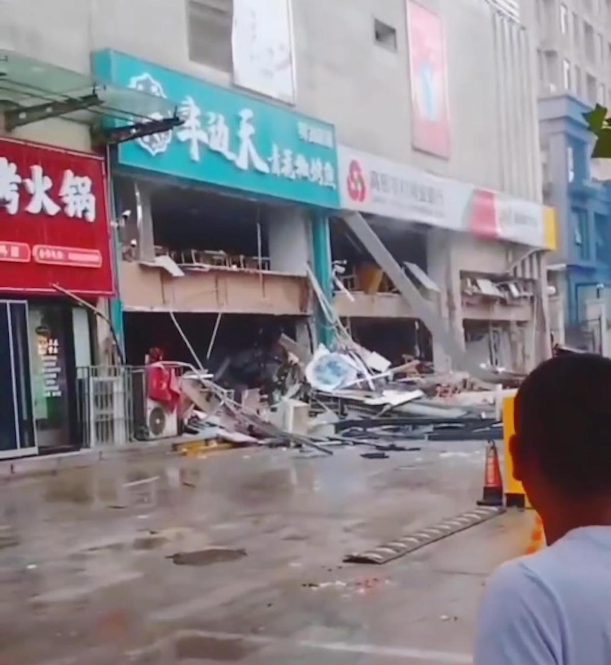 據網傳現場視頻,事發現場的一家銀行和一家烤魚店損毀嚴重,兩層樓的玻璃和外牆已不見,地面一片狼藉。門口的馬路上也受到了影響,有人員受傷倒地,也有車輛損壞。