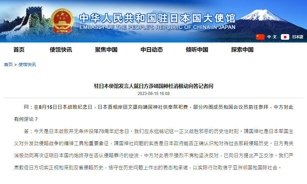 【點新聞報道】在8月15日日本戰敗紀念日,日本首相岸田文雄向靖國神社供奉祭祀費,部分內閣成員和國會議員前往參拜。對此,中國駐日本大使館表示,今天是日本戰敗並無條件投降78周年紀念日。我們應永遠銘記這一正義戰勝邪惡的歷史性時刻。