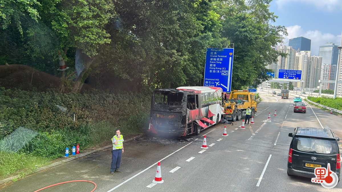 【點新聞報道】鑽石山有旅遊巴起火。事發今早(17日)近9時,一輛載客的旅遊巴士在大老山隧道往九龍方向出口附近突然冒煙起火,司機立即將車駛往路旁停下並疏散車上乘客。據悉,司機嘗試救火不果,未幾旅遊巴陷入火海。消防到場開喉將火救熄,巴士車尾燒剩車架。事件中無人受傷,起火原因有待調查。