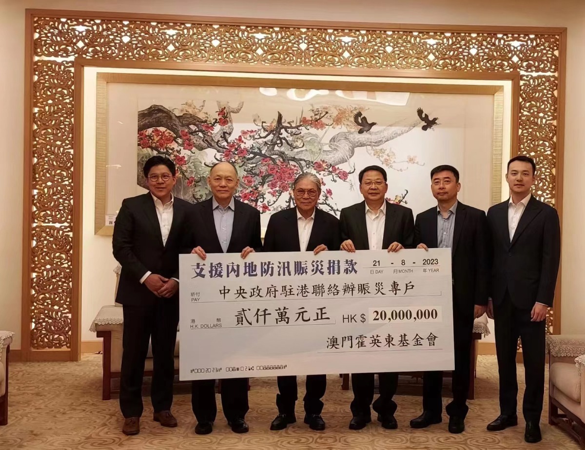 【點新聞報道】近期,受颱風「杜蘇芮」影響,京津冀地區暴雨洪澇災害嚴重。澳門霍英東基金會高度關注內地災情,為支援救災搶險和災後重建工作,8月21日上午,澳門霍英東基金會代表霍震霆、霍震寰、霍啟剛、霍啟文等到中央政府駐港聯絡辦捐款2000萬港元,由尹宗華副主任、朱文部長代表接收,捐款將經中央政府駐港聯絡辦轉至受災地區,幫助受災同胞戰勝困難。