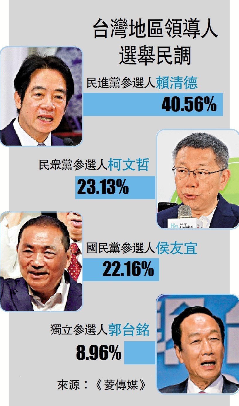 島內民調機構新公布的數據顯示,若郭台銘「獨立參選」,賴清德支持度為34.8%,侯友宜、柯文哲則相同支持率18.9%,郭台銘則僅有12.9%墊底。柯文哲日前也直言,若郭台銘參選,連選都不用選,賴清德可以開香檳了。