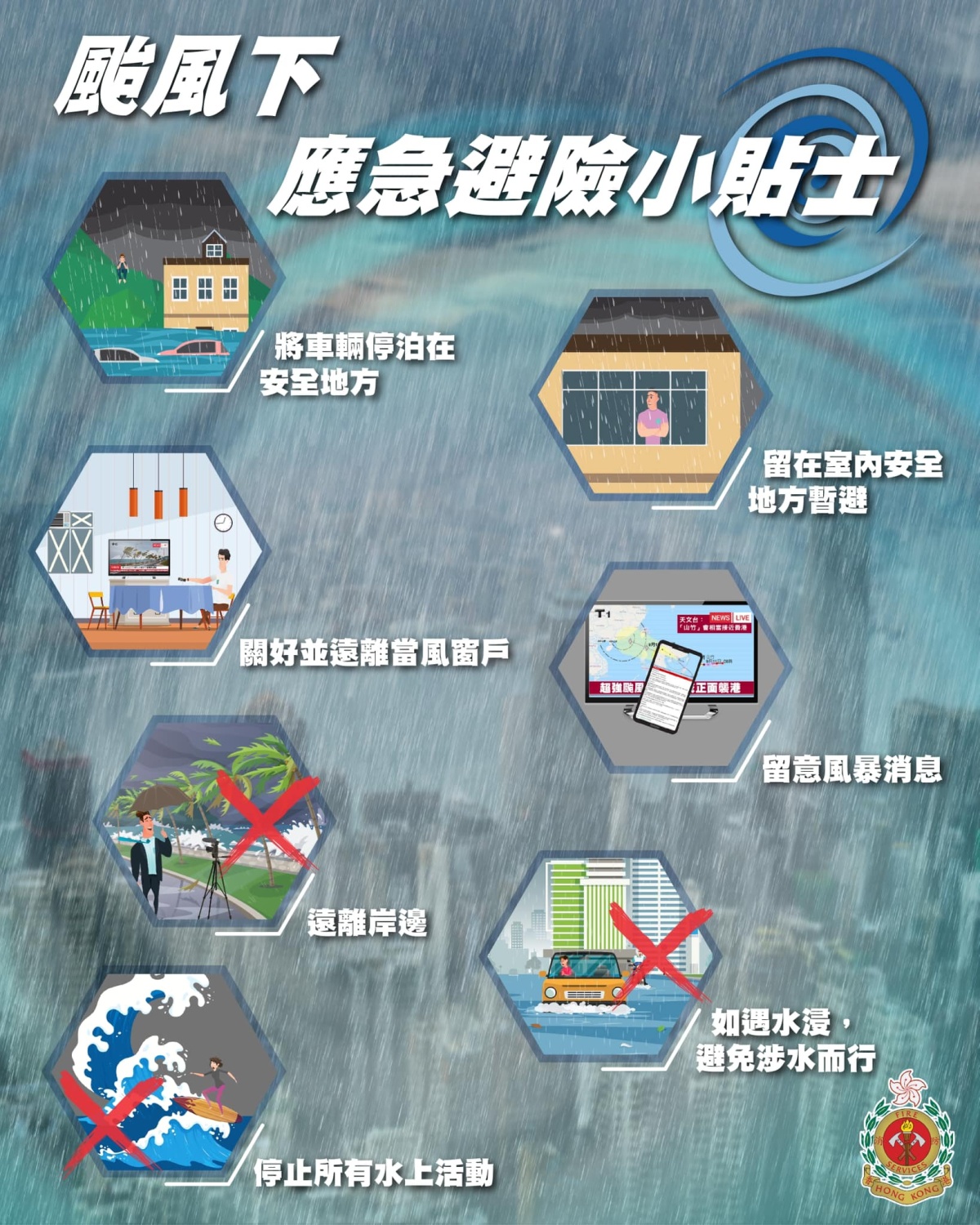 - 狂風暴雨可能引發水浸及山泥傾瀉,因此要繼續留意香港天文台發布的最新天氣消息及指示。