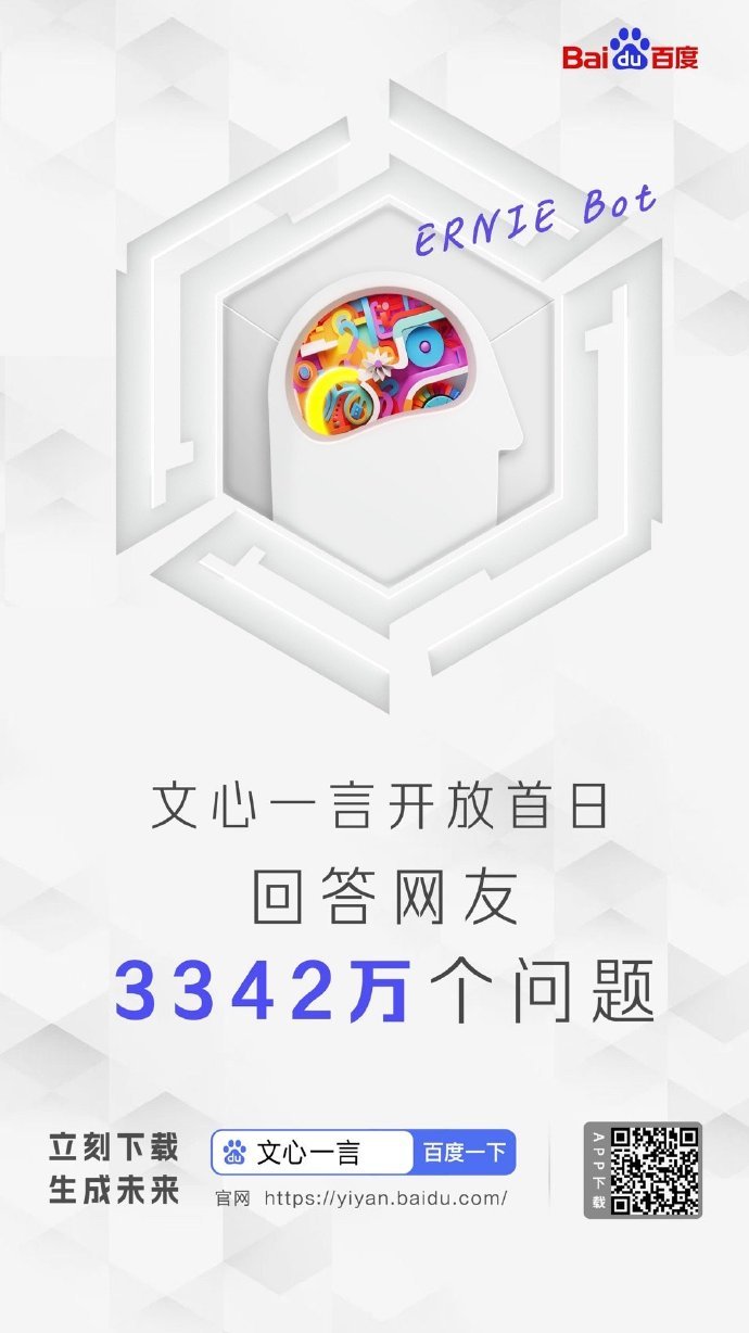 百度於官方微博表示,「文心一言」應用程式開放下載首日,運作19小時後,每日活躍用戶突破100萬名。
