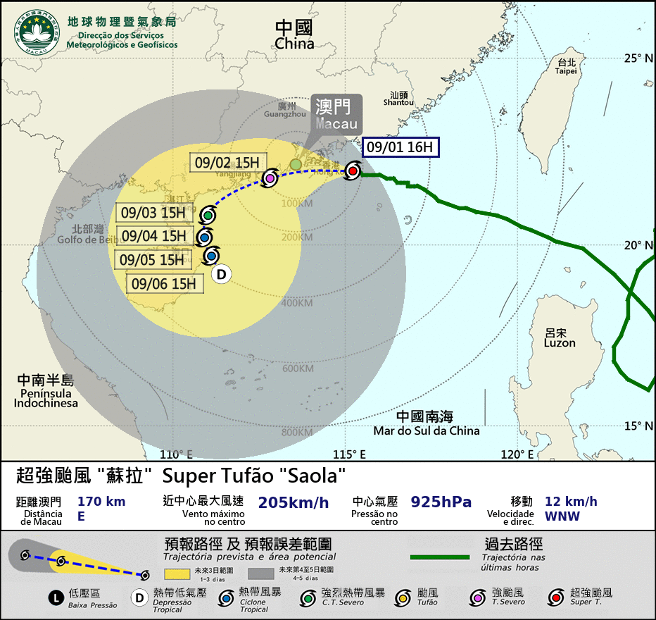 澳門氣象局表示, 根據最新觀測資料,距離「蘇拉」中心外圍約100-120公里附近已錄得10級或以上風力,預料「蘇拉」有機會正面吹襲澳門的情況下,局方今日晚間將考慮改發更高風球。 同時,由於「蘇拉」將會非常接近珠江口,受天文大潮疊加風暴潮影響,預料9月2日早上低窪地區有機會出現1.5米左右水浸,且水位可能在短時間內快速上升,橙色風暴潮警告現正生效,且不排除晚間需要改發紅色風暴潮警告。
