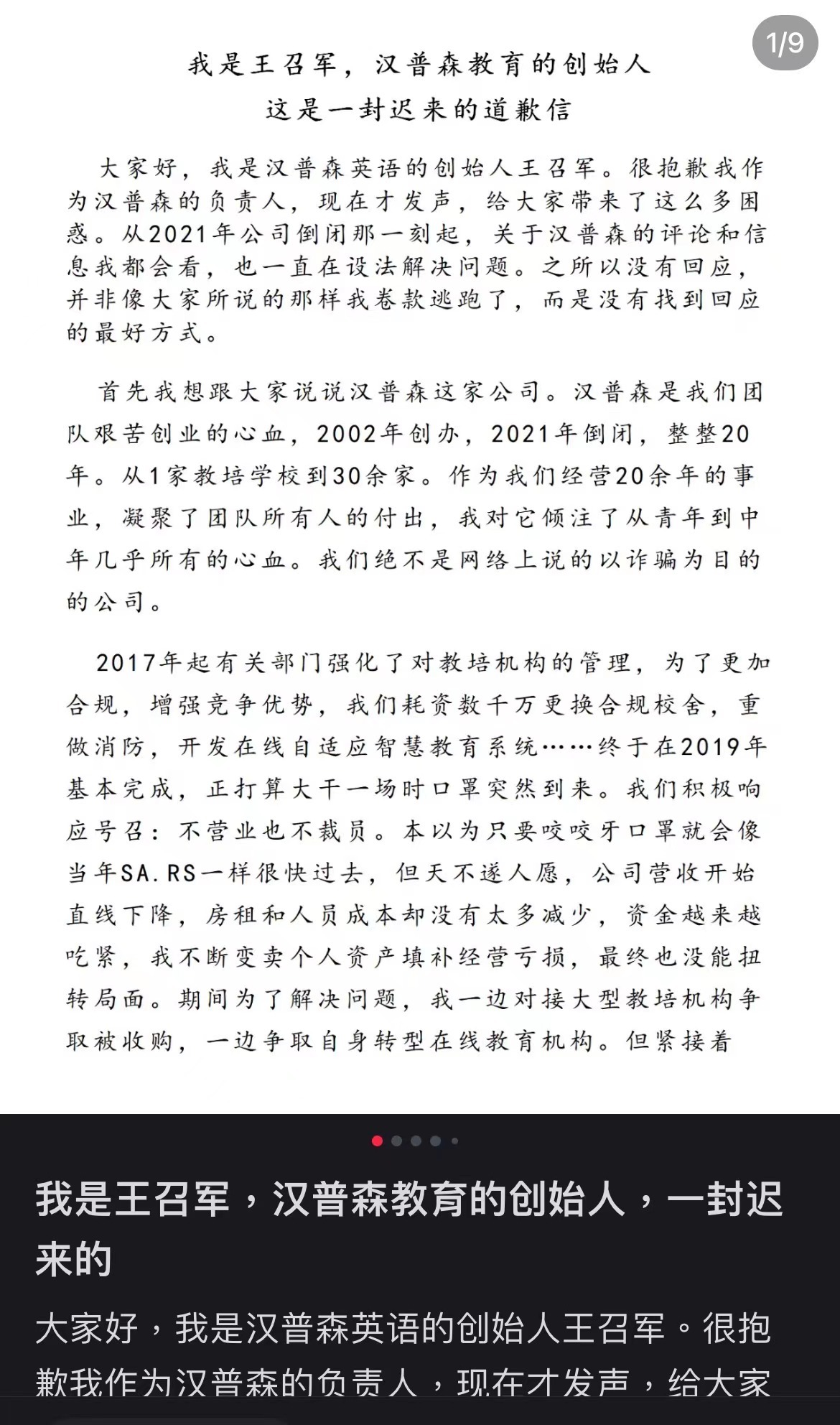 王父稱其教育中心於特殊時期被被迫結業,並非「詐騙」、「捲款」,並表示對因事件受傷害的人道歉,亦表示因事業失敗對女兒王怡然造成傷害感到內疚。