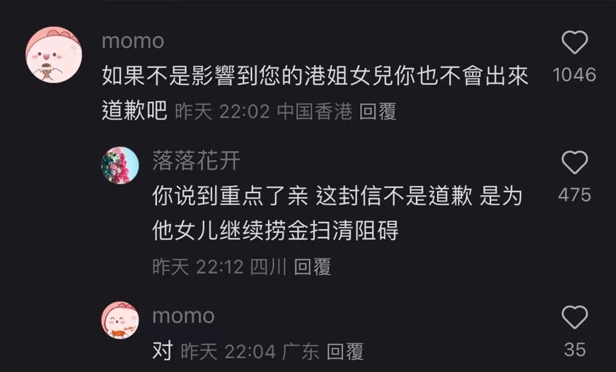 不過,網友並不「買賬」。有網友怒評:「如果不是影響到您的港姐女兒,你也不會出來道歉吧。」