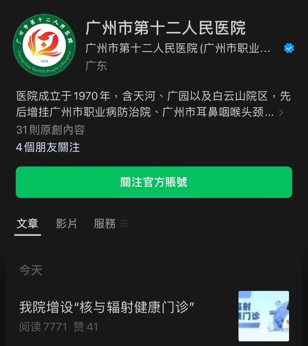 據廣州市第十二人民醫院微信公眾號發布,為方便市民對輻射類疾病的諮詢及就診,該院於健康管理中心開設核與輻射健康門診。這也是廣東省首家系統性、專業化的輻射類疾患諮詢及診療門診。