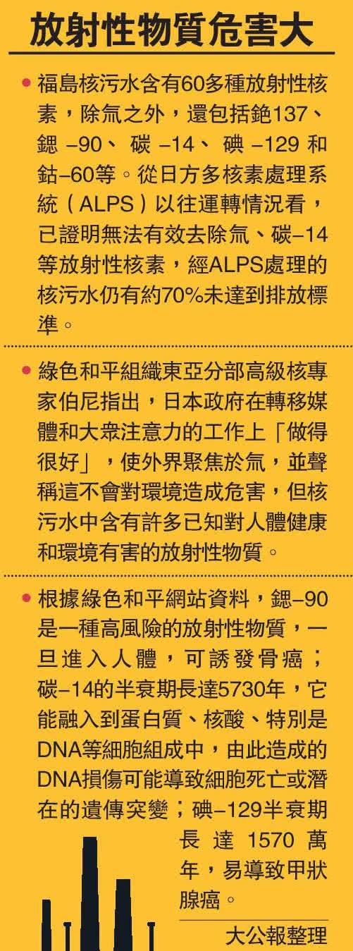 更令人擔憂的是,多家環保機構和眾多專業人士此前指出,除了氚之外,福島核污水含有60多種放射性核素,包括銫-137、鍶-90、碳-14、碘-129和鈷-60等。從日方多核素處理系統(ALPS)以往運轉情況看,已證明無法有效去除氚、碳-14等放射性核素,經ALPS處理的核污水仍有約70%未達到排放標準。