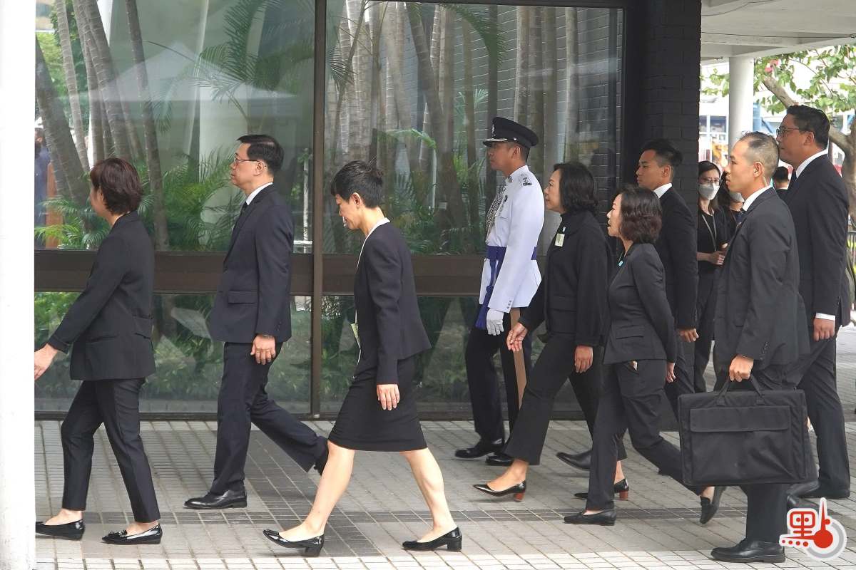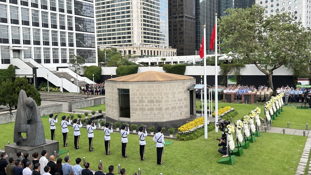 【點新聞報道】行政長官李家超、特區政府高層官員、立法會議員及社會各界人士今日(3日)上午8時出席在香港大會堂紀念花園舉行的官方儀式,紀念中國人民抗日戰爭勝利。司法人員、行政會議成員、立法會議員、退伍軍人團體、其他界別社會人士、制服團隊及青年團體代表等亦出席紀念儀式。上午7時55分,行政長官李家超抵達現場,神情嚴肅哀傷,在民政及青年事務局局長麥美娟等人迎接下步入會場。