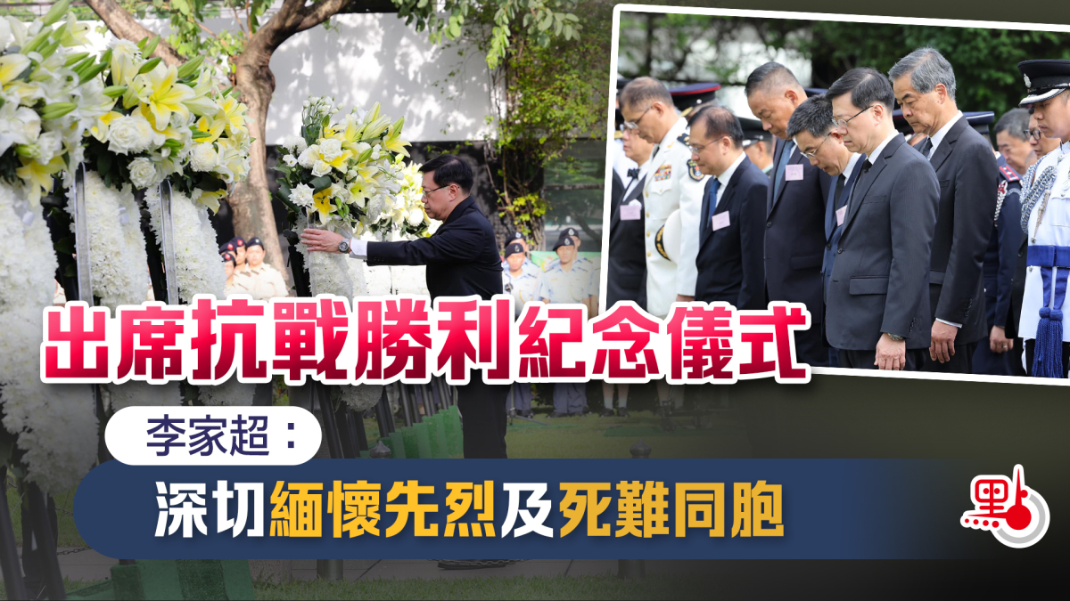 李家超在社交平台表示,當年今天,中國人民在抗日戰爭取得勝利,他向所有參與過抗日戰爭的戰士將領和人民致敬,深切哀悼在戰爭中壯烈犧牲的英靈及被侵略者殺戮的死難者,並永遠銘記中國人民抵抗日本侵略,緬懷先烈和死難同胞。