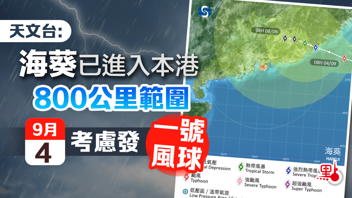 【點新聞報道】超強颱風「蘇拉」上周襲港,天文台今日(3日)預測,熱帶氣旋海葵已進入本港800公里範圍,料今日會橫過台灣南部。按照現時預測路徑,海葵會在明日(9月4日)進入台灣海峽,隨後大致移向廣東東部至福建南部沿岸一帶,但其路徑存在變數。天文台會在明早考慮發出一號戒備信號,市民請留意最新的天氣預測。