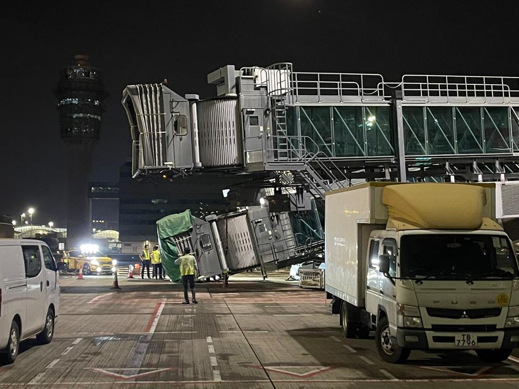 機管局證實,事發昨晚約8時,中場客運廊其中一條登機橋緩緩降下至地面,事件中無人受傷,登機橋亦沒有嚴重損壞。機管局指,受周末颱風影響,登機橋安全設施的控制箱入水產生短路,令登機橋內置的安全裝置自動啟動,將登機橋緩慢下降至地面。目前,登機橋已回復到正常位置,並進行進一步維修檢查。