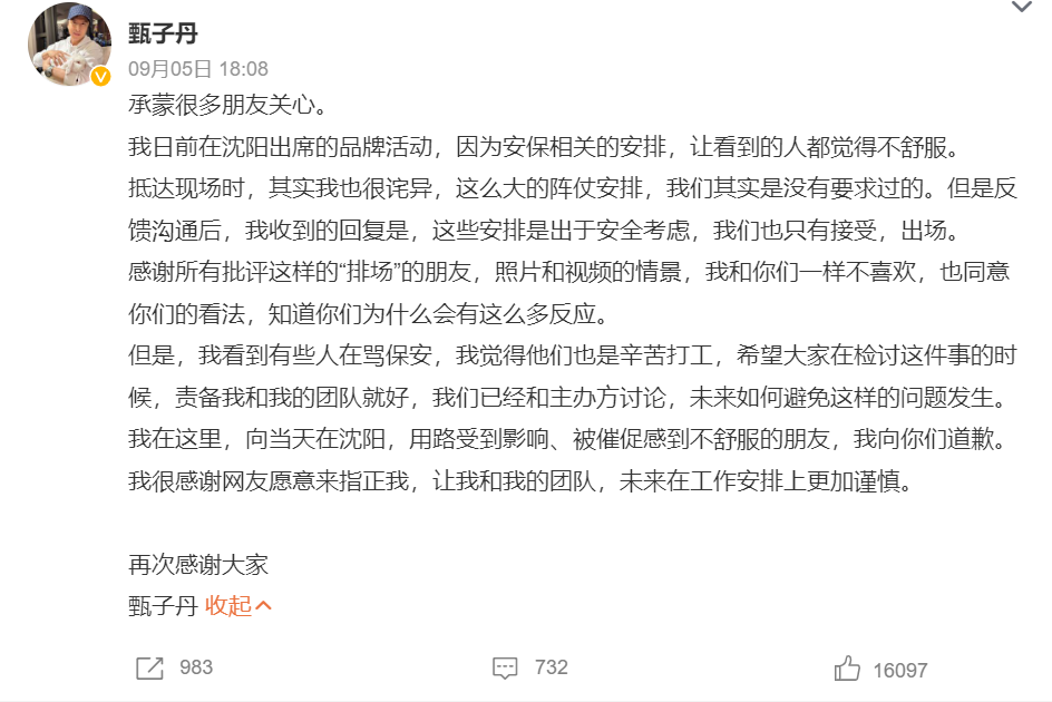 「承蒙很多朋友關心。我日前在瀋陽出席的品牌活動,因為安保相關的安排,讓看到的人都覺得不舒服。抵達現場時,其實我也很詫異,這麼大的陣仗安排,我們其實是沒有要求過的。但是反饋溝通後,我收到的回覆是,這些安排是出於安全考慮,我們也只有接受,出場。