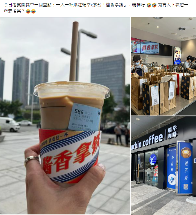 【點新聞報道】瑞幸咖啡日前與貴州茅台共同推出「醬香拿鐵」產品,通過相關優惠券每杯只需19元人民幣,單品首日銷售額更是突破1億元。醬香拿鐵不僅引發內地消費者購買熱潮,不少港人亦特意北上嘗鮮。