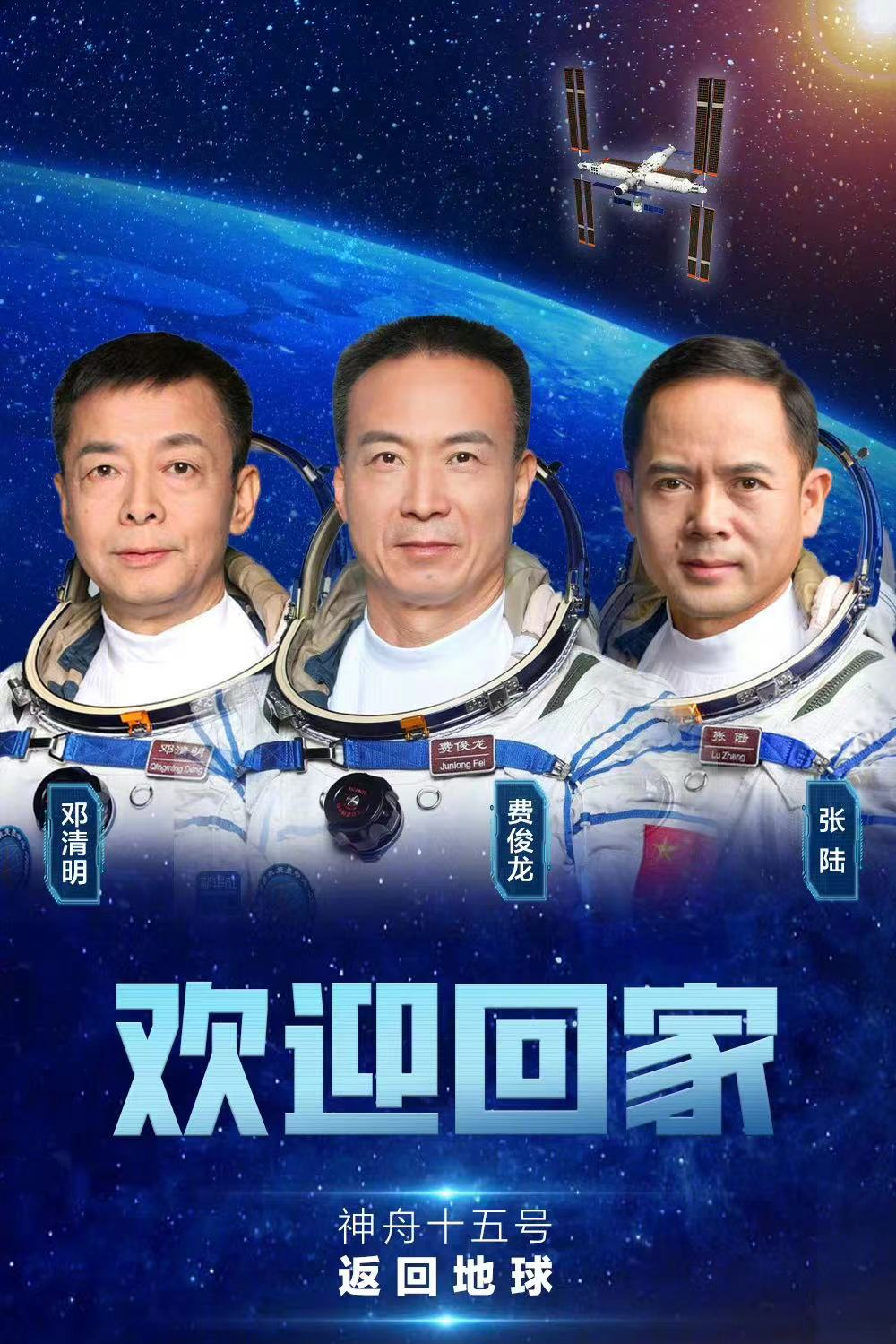 神舟十五號載人飛行任務的圓滿成功,凝聚着廣大科技工作者、航天員、幹部職工、解放軍指戰員的智慧和心血。費俊龍、鄧清明、張陸同志是其中的傑出代表,他們矢志報國、忠誠使命,堅韌執着、精誠團結,向世界展示了強大的中國精神、中國力量。費俊龍同志時隔17年再上太空並2次擔任指令長,成為中國空間站全面建成後首位出艙活動的航天員。鄧清明同志堅守25年飛天初心不改、執着追夢,出色完成一系列實驗和試驗任務。張陸同志12年如一日扎實訓練,首次飛天即穩妥完成4次出艙任務。為褒獎他們為我國載人航天事業建立的卓著功績,中共中央、國務院、中央軍委決定,給費俊龍同志頒發「二級航天功勛獎章」,授予鄧清明、張陸同志「英雄航天員」榮譽稱號並頒發「三級航天功勛獎章」。