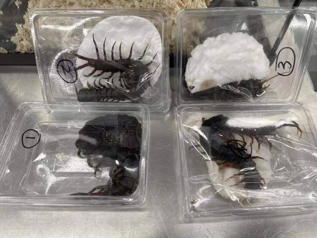 經檢查,在其褲兜、腰部、胸前檢獲綁藏的活體動物一批。經鑒定,活體動物包括9條活體王蛇、6條活體豬鼻蛇、4隻活體秘魯巨人蜈蚣、1隻活體柔蜥屬蜥蜴,均為外來物種。目前,該批活體動物已移交相關部門處理。